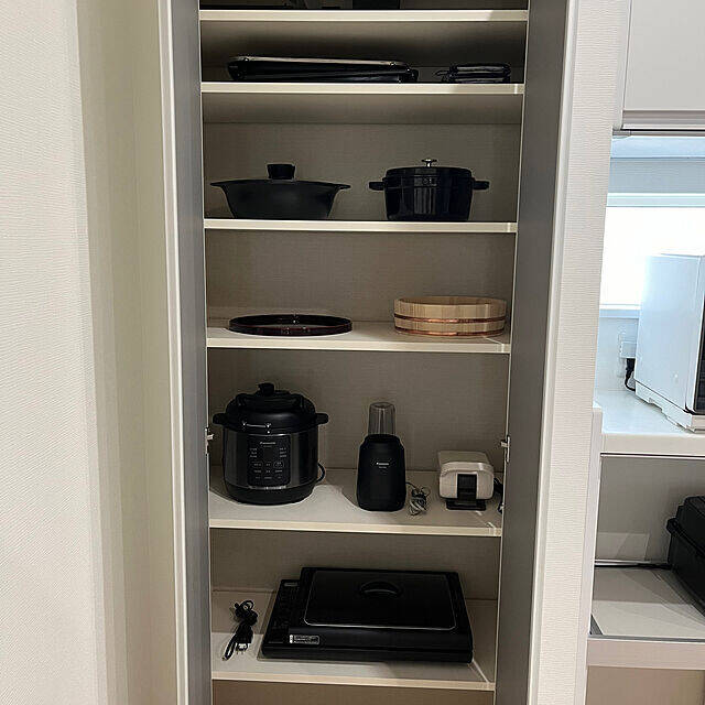 パントリーをキッチン家電や調理グッズの収納スペースにしている、aoipisuke1010さんの実例です。実例のように物と物との間を開けてゆとりを持たせると、出し入れもしやすそうですね。ギャラリーのような美しい空間には、うっとりしてしまいます。