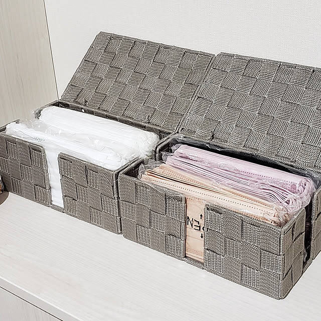 miki_houseさんがマスクケースとして使われているのは、ダイソーの電源コード収納ケース。幅や高さが、マスクのサイズにぴったり合っていますね。真ん中にスリットが入っているので、マスクを1枚ずつきれいに取り出せそう。シンプルなグレーの色合いも気に入っているそうです。