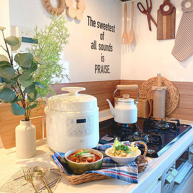 ナチュラルでカフェ風のe.and.m.mamaさんのキッチンに並ぶ美味しそうなお料理♪なんとこちらは、下準備をしてボタンを押すだけで調理できる、電気圧力鍋で作られているそうですよ!火を使いたくない暑い夏でも、快適にお料理することができそうですね。