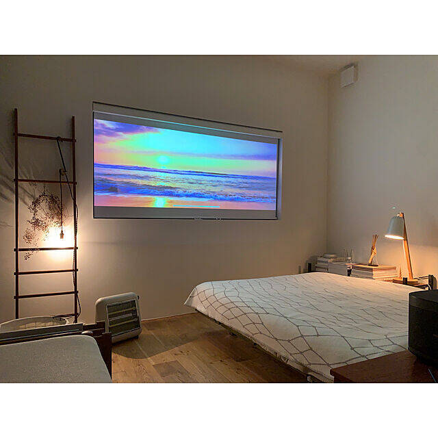 寝室をシアタールームにアレンジしたyuさん。ポイントは、ラダーに飾ったペンダントライトと、チェスト上のデスクランプです。デザイン性のあるサブ照明を選ぶと、お部屋が明るい日中もインテリアとして楽しめますね。