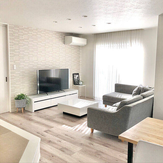 リビングを、ホワイトとグレーのシンプルな家具でまとめているpattchiさん。大容量のテレビボードの周辺は、物が少なくスッキリとしていますね。リモコンやDVDなど、テレビ周りに置きたくなる物も、たっぷり収納があれば綺麗に片付きます。