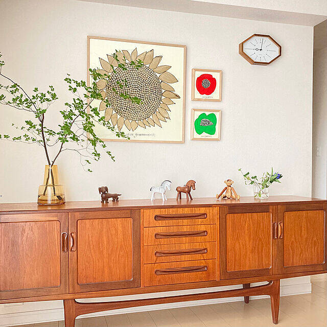 RoomClip運営チームが選んだのは、ai.saさんの投稿です。ほっと安らぎを感じるai.saさんのインテリア。棚はヴィンテージ家具とのことで、経年を感じるカラーと滑らかな取手や脚の曲線がとても美しいですね。さらに、色彩豊かなアートフレームや植物などを交えた、ぬくもりを感じるレイアウトにai.saさんのセンスが光っています♪まるで、ギャラリーの一角のような空間に見惚れてしまう素敵な投稿でした。