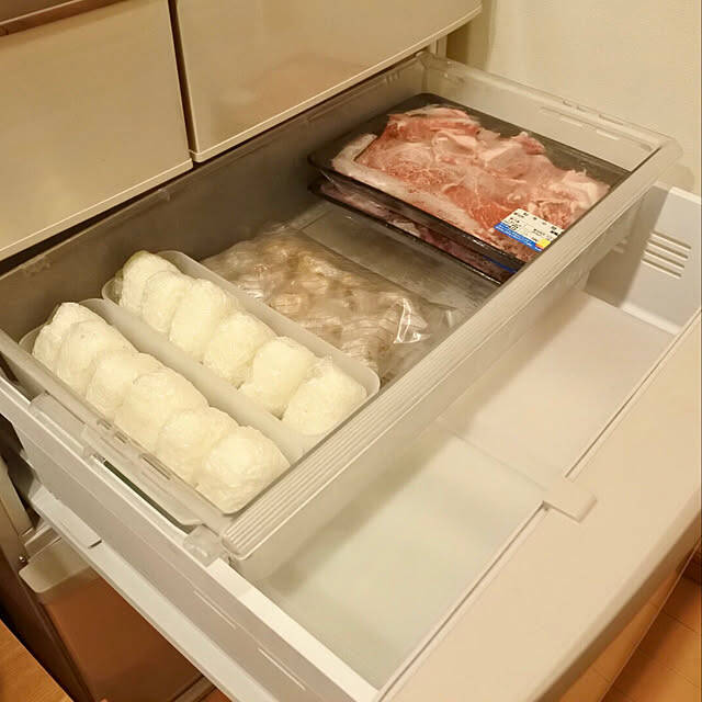 無印良品の整理ボックスに、ダイソーのおにぎり型を使い作った冷凍おにぎりをシンデレラフィットさせたのは、rakudaさんです。ラップを使いおにぎりを包んでいるので洗いものの時間も短縮されます。小腹が空いたときにさっと取り出せそうですね。
