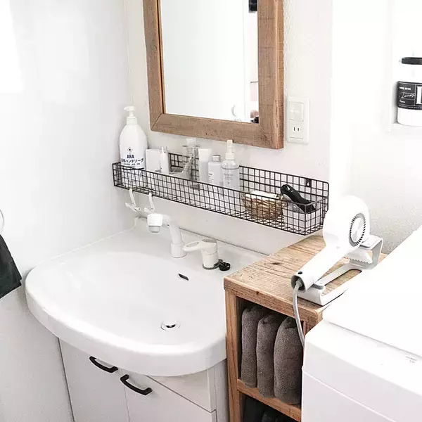 洗面台の正面の壁に黒いワイヤーバスケットを設置している、ユーザーさんがこちら。幅があるので収納力が高く、ハンドソープやボトル類などをまとめて収納できていますね。ワイヤーバスケットなので水切りもでき、カビ対策になりそうです。シンプルナチュラルな雰囲気にもよく馴染んでいますね。