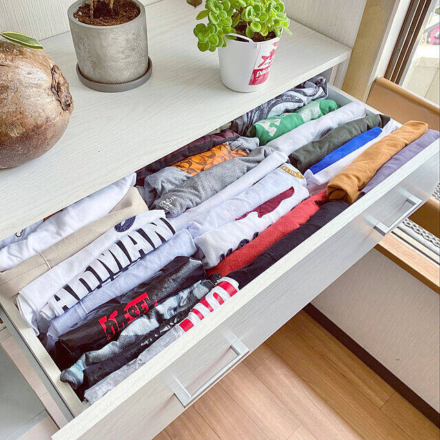 衣類を重ねて収納すると、上にある服しか見えず、着たいものを探しているうちに綺麗にたたんだ状態が崩れてしまうことも。minu5656さんのように立てて収納することで、ひと目で場所がわかるので1枚ずつ服をめくることがなくなり整理整頓がキープできます。探す手間も省けて一石二鳥ですね。