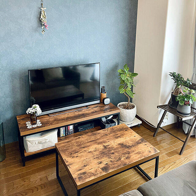 yasuyo66さんのリビングでは、テレビ台とセンターテーブルをニトリのステインシリーズでそろえていました。ダメージ風に仕上げられた天板と、スチール脚を組み合わせたデザインには、おしゃれなヴィンテージ感がただよっています。天板が広くつくられているので、食卓やワークスペースとしても使えますね。