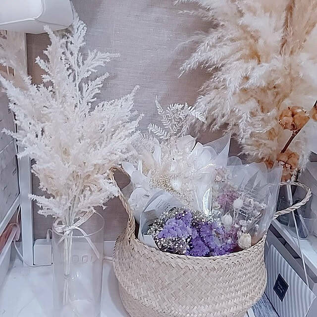pinorinさんはベッドサイドにバスケットを置いて、やわらかな色合いのドライフワラーを飾っていらっしゃいます。ドライフラワーのやさしい量感だけではなく、使っているリボンやラッピングペーパーにもこだわりが感じられて心地よく眠りにつけそうですね。