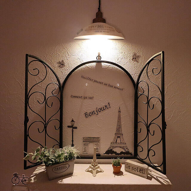 出窓部分をディスプレイコーナーとして利用されているmadamkaoriさんは、さまざまな種類のライトを飾られています。ペンダント型のライトがダイソー商品。夜になると目隠しシートに灯りが反射して綺麗に輝くそうですよ。ますますティータイムが楽しくなりそうですね。