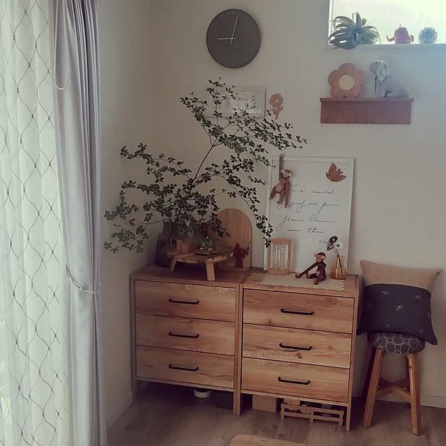 ku-kaiさんはニトリのウォールシェルフを使って、リビングの一画にディスプレイスペースを追加していました。ドウダンツツジが映えるウッド調のインテリアを集めた空間は、可愛らしくあたたかみがあります。壁面を上手に使うことで、立体的でバランスのよいコーディネートに仕上げられています。