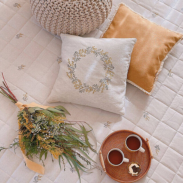 milkcocoaさん宅で見つけたのは、デコホームのミモザシリーズ。キルトラグやクッションカバーなど、どれもミモザのデザインやカラーがインテリアにさりげなく彩りを添えてくれますよ。複数取り入れても主張しすぎることなくインテリアに溶け込み、優しい雰囲気の空間が完成しています。