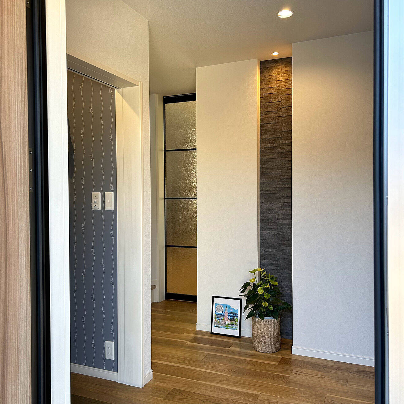 miffy.0044さん「玄関アプローチは横に広く! お友達がたくさん来ても大丈夫…。シュークロの壁紙はかくれんぼミッフィー1階はぐるっと1周できる回遊動線がこだわりポイント。」