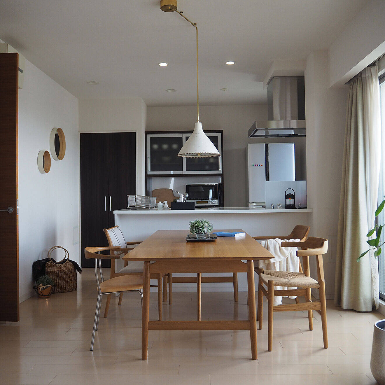 sao.minimallifeさん「オープンキッチンはすっきり空間に!4脚の椅子は家族それぞれ好きな椅子です。」
