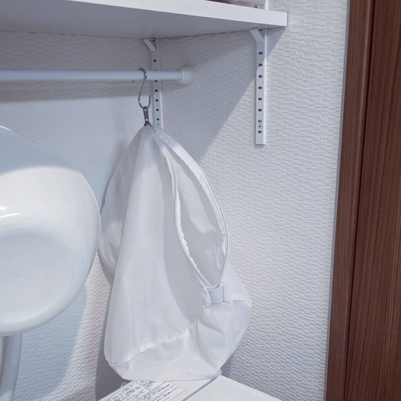 mi-saさん「靴下を入れて洗濯します。洗濯機の上にぶらさげて、各自脱いたらネットに入れたいので、本体にループがあるけれど、開口部が下を向いてしまうので、ファスナーの金具の穴をフックにかけています。脱いですぐ入れて、そのまま洗濯するので行方不明にならずオススメです。」
