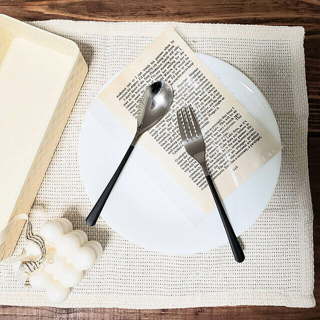 puritan_rさんがセリアで購入されたのは、持ち手がブラックのスプーンとフォークです。カトラリーケースとランチョンマットも同じくセリアでそろえて、プチプラおうちカフェセットにされているとのこと。シックな雰囲気がとってもおしゃれです。