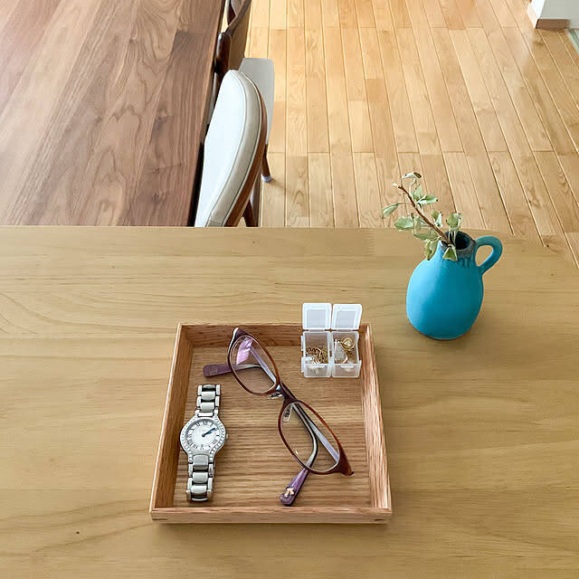 tokonekoさんは木製トレーにアクセサリーを置いて収納しています。床やテーブルと木目素材をそろえていて、トレーが主張しすぎることなくインテリアに馴染んでいますね。トレーに置いているイヤリングやネックレスは無印良品のピルケースに入れて収納する工夫もされていますよ。