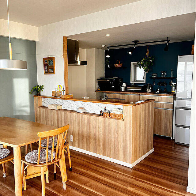 amさんはカウンターの壁と食器棚にリメイクシートを貼ってキッチンの印象をチェンジ。ナチュラルなリビングと相性のいい木目のシートを使うことで、よりあたたかみのある空間になっています。剥がせるタイプは賃貸OKのシートも多いので、壁を傷つけられなくてDIYに踏み出せない、という方にもおすすめですよ。