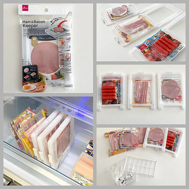 こちらのユーザーさんは、ダイソーの「ハム&ベーコンキーパー」と「透明収納仕切り」を使って、ハム類を立てて収納していました。封を切ったハムなどが、どこにどれだけあるのか、一目瞭然ですね!使いかけのハムやベーコンを見つけられず、新しいものを開けてしまった経験のある方、要チェックですよ。