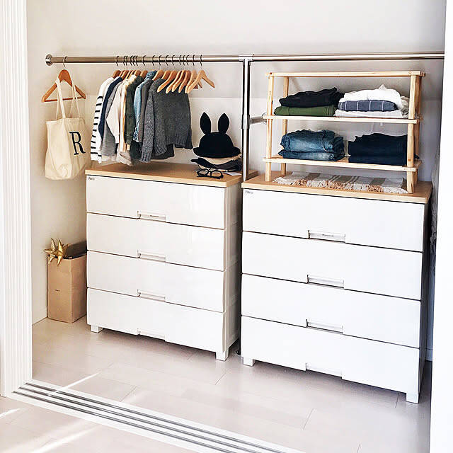 ウォークインクローゼットの中にタンスを置いて使っているという、Mamiさん。息子さん用とMamiさん用でタンスを分けて管理しているそう。クローゼットとタンスを組み合わせることで、ポールハンガー下のスペースを有効に使うことができますね!