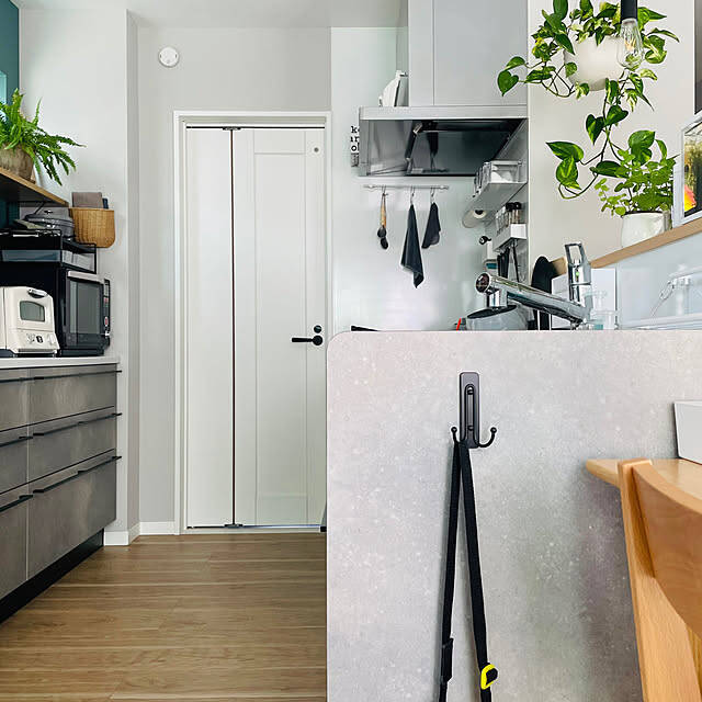 キッチン横にフックを付けて、子どもの水筒カバーやミニトートを掛けたりしています。