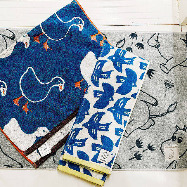 しまむらは、よくしまぱとします♪アヒルさんのバスマットは以前からのもので、新たにムーミンを購入!あとタオルも好みのものを選びました。