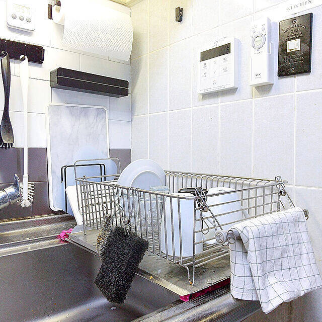 yuuさんは、水切りかごにワイヤークリップと突っ張り棒を取り付けて、ふきんを掛けを作られていましたよ。スポンジは、クリップに挟んでそのまま水切りかごに引っ掛けて収納にされていました。ふきんをどこに掛けておいたらよいか迷っている方は、ぜひ参考にしてみてくださいね。