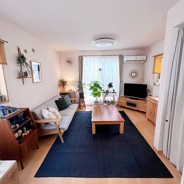 北欧ナチュラルテイストにしている、masumiさんのリビングです。木製の家具やグリーンなどが取り入れてあって、自然素材ならではの心地よさを感じさせますね。床に敷いてあるラグのブルーが、お部屋を引き締めて見せてくれています。