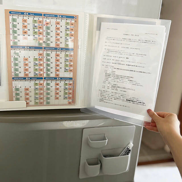 こちらのキングジムの収納ファイルは、A4サイズの書類からレシートまでさまざまな書類の保管に役立つアイテムです。mako2yaaさんは、1次置きしたい書類などをこちらのファイルに入れて保管されています。強力磁石を付けることで、冷蔵庫から落ちにくいように工夫されていますよ。