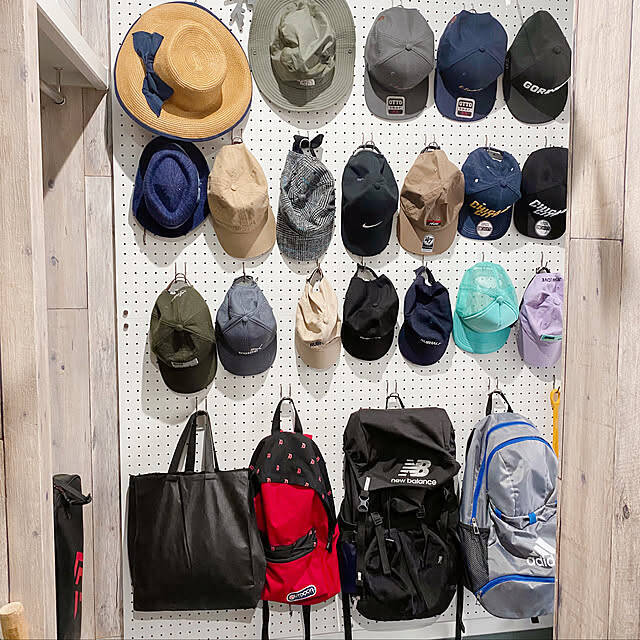 増えていく帽子の整理のために、有孔ボードで壁面収納を作られたsuzucoさん。見やすく収納されていて、まるで帽子屋さんのようです。有孔ボードは好きな高さにフックなどをつけることができるので、整理するアイテムに合わせて場所を設定できるのがうれしいポイントです。