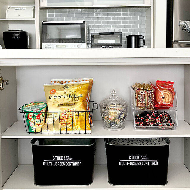 お菓子の消費が多いというa.roseさんのおうちでは、たくさんのストックを大きめのカゴ2つに収納されていました。下のカゴには大きな袋もの、上のカゴには小さめのものと箱ものに分けているそうです。蓋付きなので重ねれば、見た目もスッキリとして省スペース。丸みのある形が可愛いですね。