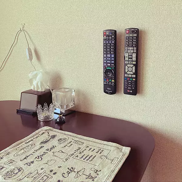 ダイニングテーブルの横の壁にリモコン収納をしました。セリアで売っていた「フックを見せずに壁にスッキリ収納できる両面テープフック(2セット入)」を使ってみました。
