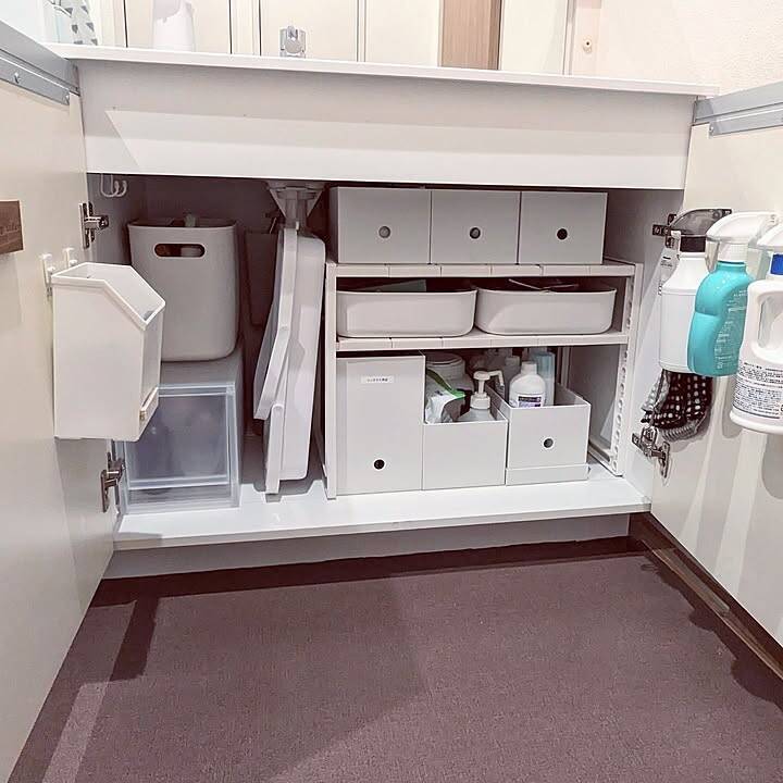 「洗面所の収納にもサイズに合わせて使用してます♪中身はごちゃごちゃしてても色味を抑えてスッキリ見せてくれるので、無印の収納ケースで統一してます!」