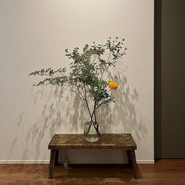 k3さんは玄関に切花と枝物を飾っています。スポットライトと自作のテーブルを活用して、植物を程よく引き立てていますね。玄関に入った瞬間に季節感を感じられて、ホッと癒される空間になっています。