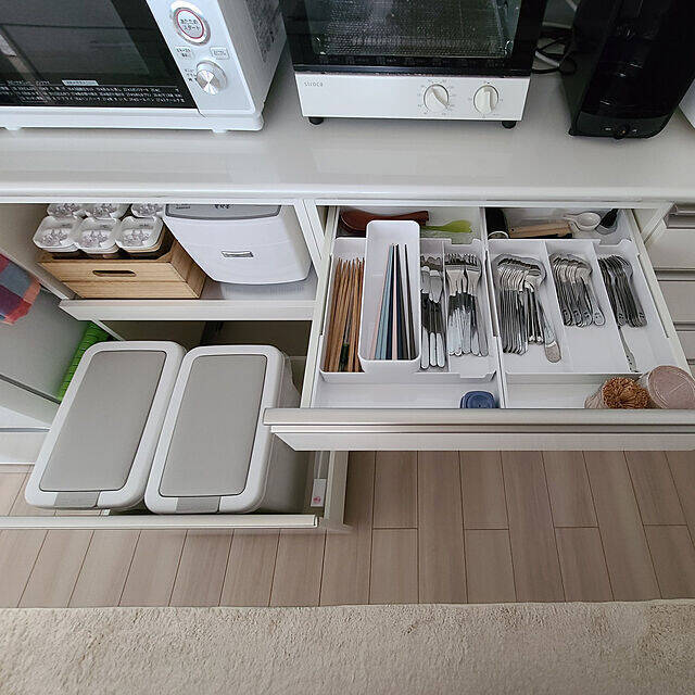 整理トレーをカトラリーのサイズに合わせて組み合わせて活用しているsh.atyouさん。ホワイトのトレーは清潔感があって、シンプルなデザインが引き出しの中をすっきり見せてくれます。sh.atyouさんのようにカトラリーの素材や形をそろえることで、より統一感が出て気持ちのいい収納になりそうですね。