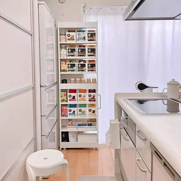 mikiさんは、キャスター付きの隙間収納ラックを冷蔵庫横に入れ込んでいました。ドリンクカプセルを入れているケースには切り取ったボックスを貼ることで、まるでお店屋さんのような雰囲気になっていますね。カップ類も置いてあるので、1か所でティータイムの準備ができます。