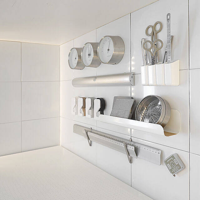 tuuliさんは、スチールタイルを貼った壁面にマグネット収納グッズを貼っています。こちらのスペースでは、ダイソーのマグネット付きテープカッターやセリアのマグネット付き歯ブラシスタンドなどを使っているそう。ツールはそれぞれの置き場を決めておくと、出し入れもスムーズにできます。