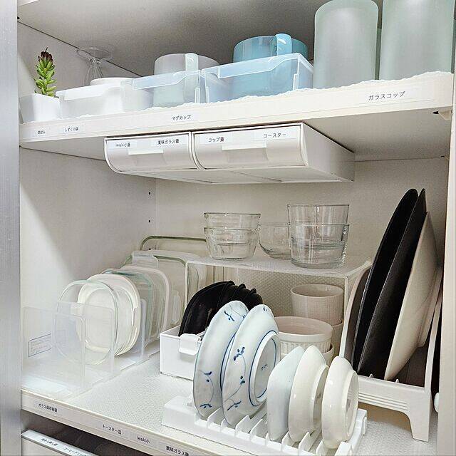 食器棚にダイソーの取り付け式引き出しをつけているのは、love1017さんです。棚の中で迷子になりがちなものも、これなら綺麗に収められそうですね。棚への設置は粘着ゲル両面テープを使っているとのことですよ。