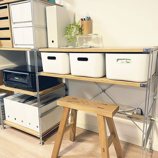 無印良品のユニットシェルフとオーク材ベンチを組み合わせて、ワークスペースにされているというyacchiさん。無印良品でそろえられた統一感のあるスペースでは、作業にも集中しやすそうです。コンパクトなベンチは、引き出して使うときも楽そうですね。