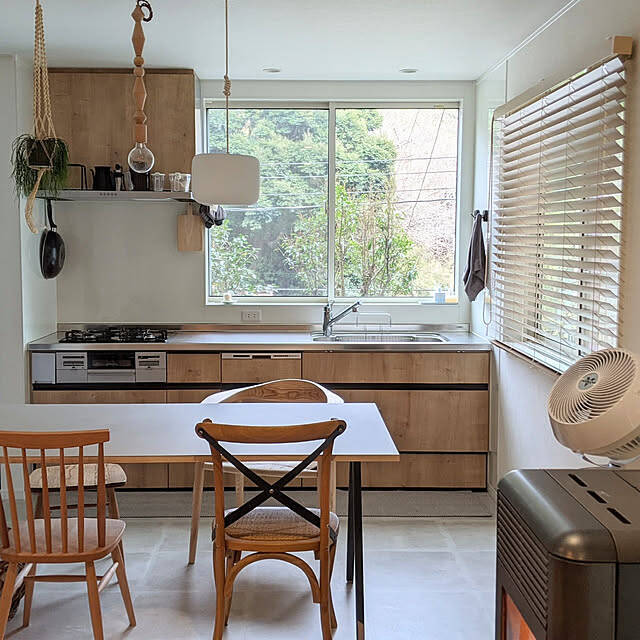 おうちの中で一番に好きな場所だという、hira_muji_mihiさんの壁付けキッチン。ステンレス製のキッチンがとてもスタイリッシュで目を引きます。窓からの光で、窓辺や天井のグリーンが鮮やかに映えますね。植物や自然素材を取り入れたコーディネートが心地よく、キッチンに立つのが気持ちよさそうです。