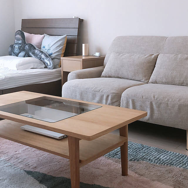 mm_kbrさんはテーブルの下にノートパソコンを置いています。テーブルの下に置くことで、使いたいときにサッと出して使うことができますし、埃などで汚れる心配が減りそうです。ナチュラルなお部屋の雰囲気を邪魔することなく、インテリアに馴染んでいますね。