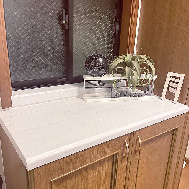 sun4さんは、玄関収納の天板にダイソーのリメイクシートを貼られています。ホワイトカラーの木目柄は、空間をパッと明るくさわやかな印象に。家具全体ではなく、部分的に貼るだけでもイメージを変えられるのはうれしいですね。