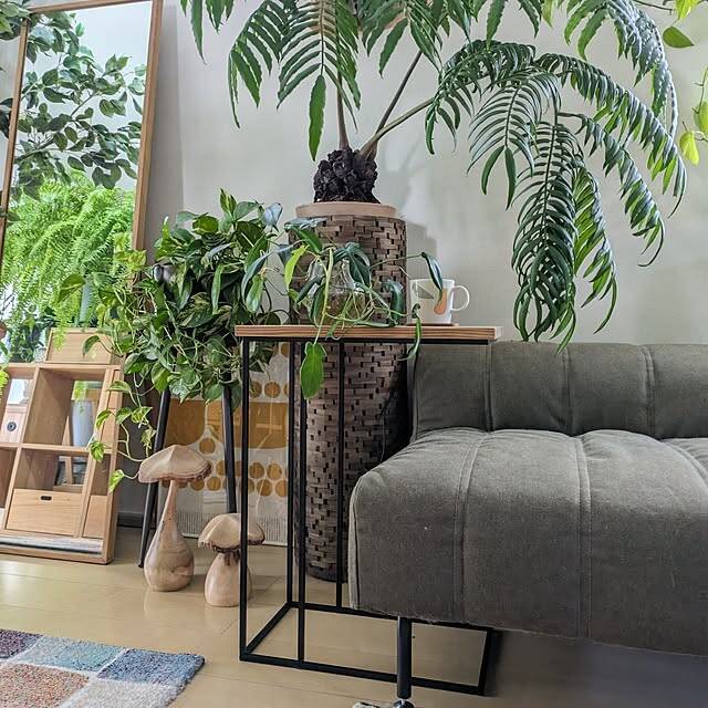 ayamameさん宅のリビングで見つけたのは、アイアン素材と木目の組み合わせがカッコいい、サイドテーブルでした。線で描かれたムダのないコの字型のデザインがインテリアの引き締め役となり、観葉植物に囲まれたボタニカルでモダンな雰囲気にアクセントを添えています。