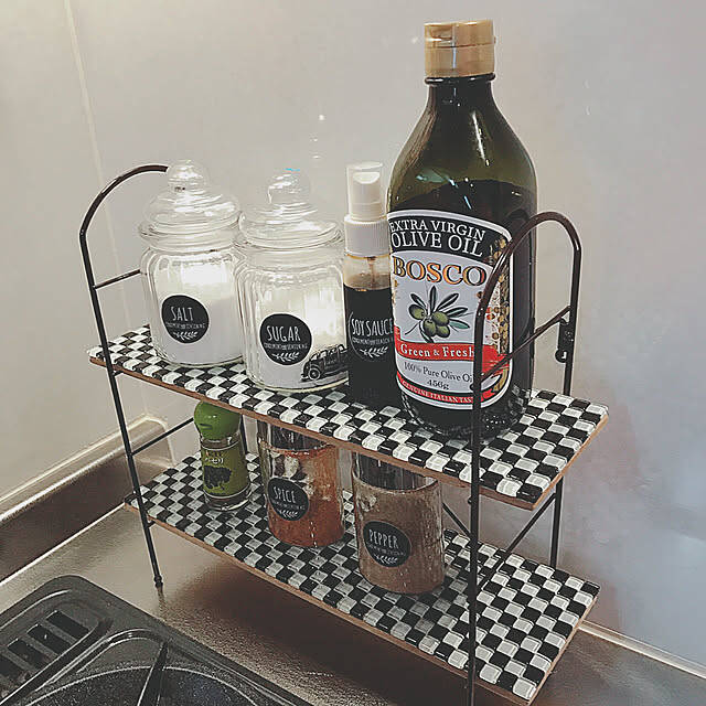 Yukiiiii0810さんは3COINSのラックの棚板に、ダイソーのガラスタイルをボンドで貼りつけていました。黒×白のタイルがフラッグチェック柄のようで、アメリカンダイナーを思わせますね。