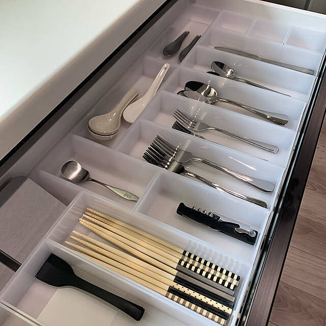 yocchanさんが使っているのは、セリアのカトラリーケースです。大小のサイズを組み合わせてシンデレラフィットが実現していますね。セリアのカトラリーケースは、カトラリーのサイズに合わせて中の板を自由に動かして仕切れるので使いやすそうです◎