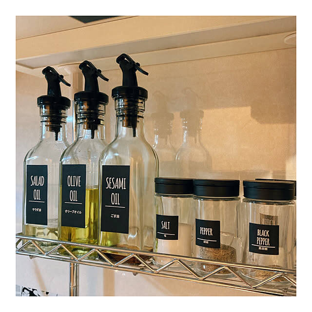 カフェ風インテリアにしているユーザーさんです。ラックに収納されたオイルや調味料のボトルを黒で統一していました。オイルボトルとスパイスボトルの形が違っていても、アクセントカラーを黒にして、同じデザインのラベルを付けることで統一感を出しておられます。