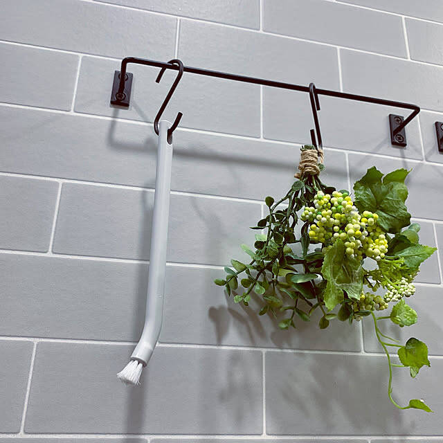 無印良品の隙間掃除シリーズの使い勝手が良いと、シリーズでそろえられているKaeru-Mamaさん。洗面台下の収納スペースにつっぱり棒を設置してフックを付け、吊るして収納されています。持ち手に穴があるので収納も便利ですね。
