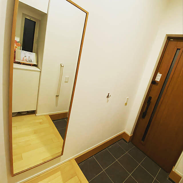 こちらの実例では、スタンドミラーを玄関に壁掛けしています。無印良品のスタンドミラーで、場所を節約するため壁美人を使い設置したそうですよ。ホッチキスであまり壁を傷つけずに固定できています。木の枠が周りのインテリアとよく似合っていて、落ち着いた玄関に仕上がっています。