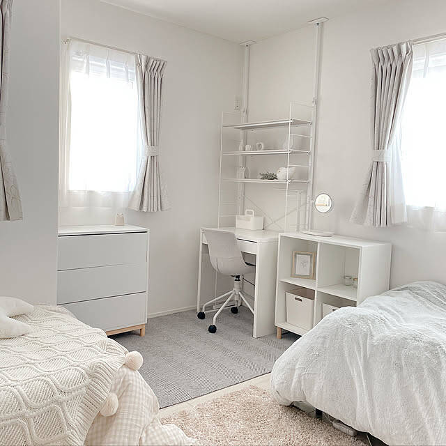 こちらの左側の窓の下に置かれているのは、エーケトのシンプルなキャビネットです。真っ白にコーディネートされたお部屋とよく馴染んでいていいですね。右側の窓の下に置かれているオープンキャビネットも、実はエーケト。統一感あるホワイトの家具で、収納もディスプレイも充実したお部屋が完成しています。