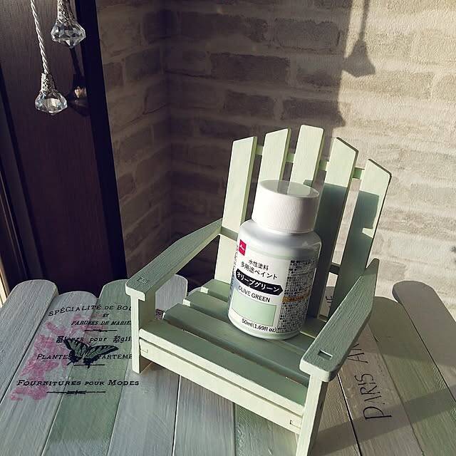 meiさんが使用されていたのは「水性塗料多用途ペイント」という商品です。こちらの実例では、オリーブグリーンのカラーを使って椅子を塗装されていました。他にもニュアンスカラーがたくさん並んでいたそうで、カラーバリエーションが豊富なのもうれしいですね。