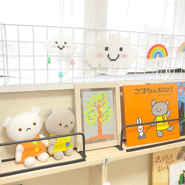 絵本やぬいぐるみが飾られたコーナーに、アイロンビーズ作品を添えているAさんの実例です。にっこり笑顔の雲が愛らしく、ワクワクするコーナーになっていますね。シンプルな空間を楽しくできる、ナイスアイデアです。