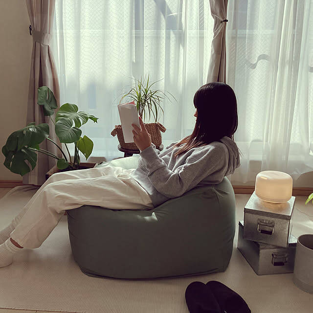 限定色のよもぎ色の「体にフィットするソファ」を使われているotttyoさん。ソファの中には非常に細かなビーズが入っているので、姿勢に合わせて形が柔軟に変化してくれます。こんな風に、本を読むときもとても楽な姿勢を保てますよ。一度座ったら離れたくなくなる、そんな魅力のあるソファです。